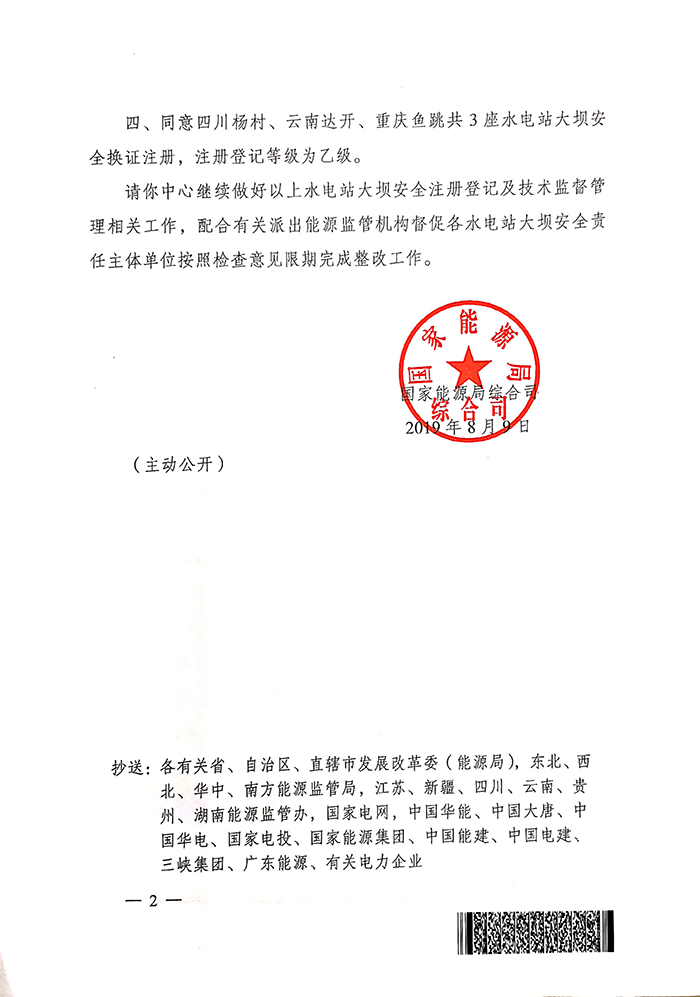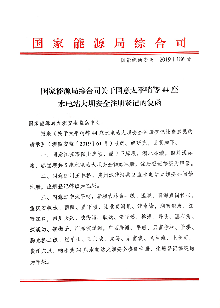 国家能源局综合司关于同意太平哨等44座水电站大坝安全注册登记的复函