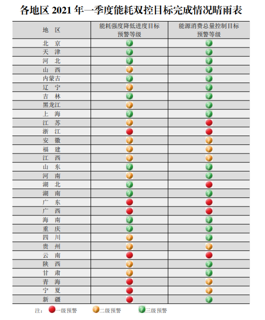 据国家发展和改革委员会官网消息,为加强能耗双控形势分析预警,国家发改委近日研究提出《各地区2021年一季度能耗双控目标完成情况晴雨表》,显示在能耗强度降低方面,浙江、广东、广西、云南、青海、宁夏、新疆7个地区为一级预警,山西、辽宁、黑龙江、江苏、安徽、福建、江西、河南、四川、贵州、陕西、甘肃12个地区为二级预警,其他11个地区为三级预警。