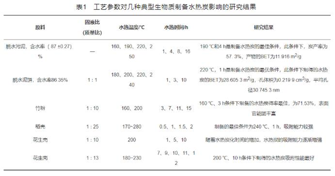 表1归纳了工艺参数对几种典型生物质制备水热炭影响的研究结果。