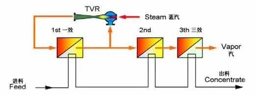 热力蒸气再压缩蒸发(TVR),将一部分二次蒸汽压缩,提高热焓后作热源,节省了部分生蒸气,比MEE工艺更加节能,但TVR在蒸发过程中仍需连续供给生蒸气。