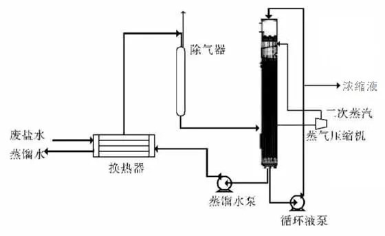 “降膜式机械蒸汽再压缩循环蒸发”是在MVR的基础上,采用降膜式蒸发,并在蒸发器下部设置浓盐水循环泵,在浓盐水首次经过蒸发器未达到所需浓度时,可通过循环泵打到蒸发器顶部再次循环,直至达到所需浓度。该工艺采用单效蒸发器可以达到多效蒸发的效果。