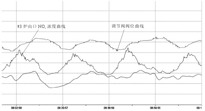 问题三:喷氨调整门自动控制异常问题。如图2所示,红色是#3炉出口NOx浓度曲线,蓝色是调节阀阀位曲线。分析可知,#3炉喷氨自动控制存在明显的等幅振荡、滞后情况,静态时设定值为35mg/m3,实际出口NOx浓度在22~43mg/m3范围内等幅振荡,周期为24min。