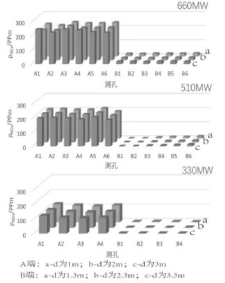 三个工况下SCR 脱硝装置反应器出入口NOx浓度分布如图1所示,测试深度为A 端:1m2m 3mB 1.3m2.3m 3.3m。从结果中可以看出:脱硝装置出口NOx浓度总体分布较为均匀。高负荷下(660MW 510MW)SCR 入口NOx浓度较高,平均值大于200ppm(410mg/m3);出口浓度最大值为21ppm(43.05mg/m3) 低于超低排放限值50mg/m3,达到了超低排放的标准。满负荷下SCR 装置的脱硝效率可达到92.2%,相比于改造之前(87%) 得到了显著的改善。