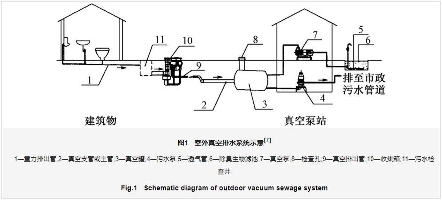 室外真空排水系统由便器、收集箱、真空管网、真空泵站等组成(图1),具有可采用重力卫生洁具,需专用阀门井、布置特殊的管道等技术特征。收集箱由污水收集室、真空阀、控制器、感应管、箱体等组成。真空泵站含有真空罐、真空泵、污水泵等设备。